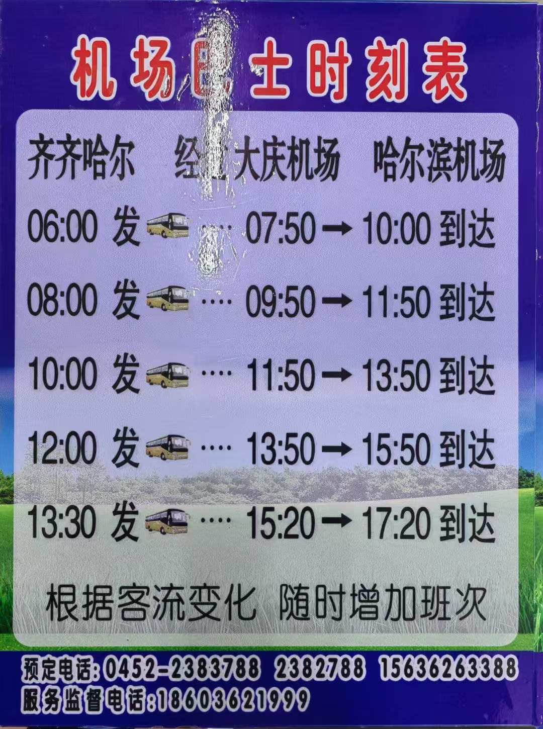 黑龍江天成運(yùn)業(yè)集團(tuán)齊齊哈爾客運(yùn)有限公司齊齊哈爾至哈爾濱機(jī)場(chǎng)巴士于2009年開(kāi)通,巴士開(kāi)通以來(lái)秉持“安全第一、服務(wù)至上”原則,真心臻誠(chéng)、專(zhuān)業(yè)服務(wù),每年運(yùn)送旅客20萬(wàn)人次。機(jī)場(chǎng)巴士配置12米35座大型高一級(jí)商務(wù)客車(chē),全承載車(chē)身、氣囊懸掛,安全舒適、便捷直達(dá)。專(zhuān)業(yè)駕駛隊(duì)伍、優(yōu)中選優(yōu),保證安全。巴士應(yīng)急全程與交警、交通、機(jī)場(chǎng)聯(lián)動(dòng),迂特殊天氣、特殊路況,應(yīng)急準(zhǔn)備充分、措施得當(dāng)、擔(dān)當(dāng)負(fù)責(zé),確保旅客利益不受傷害。機(jī)場(chǎng)巴士免費(fèi)提供代辦登機(jī)牌、代送衣物、兒童陪伴、老人看護(hù)、賓館預(yù)定服務(wù),隨身行李免費(fèi),提前退票、改簽免費(fèi),夏季礦泉水免費(fèi),當(dāng)日客票全天乘車(chē)有效,電話(huà)問(wèn)詢(xún)即可訂票,人性化服務(wù)讓您感到溫暖舒心。